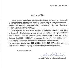 Jako Zarząd Bonifraterskiej Fundacji Dobroczynnej w Konarach w ramach której działa Dom Pomocy Społecznej, w którym mieszka 63 niepełnosprawnych mieszkańców, zwracamy się do Państwa z PROŚBĄ i APELEM O POMOC.
