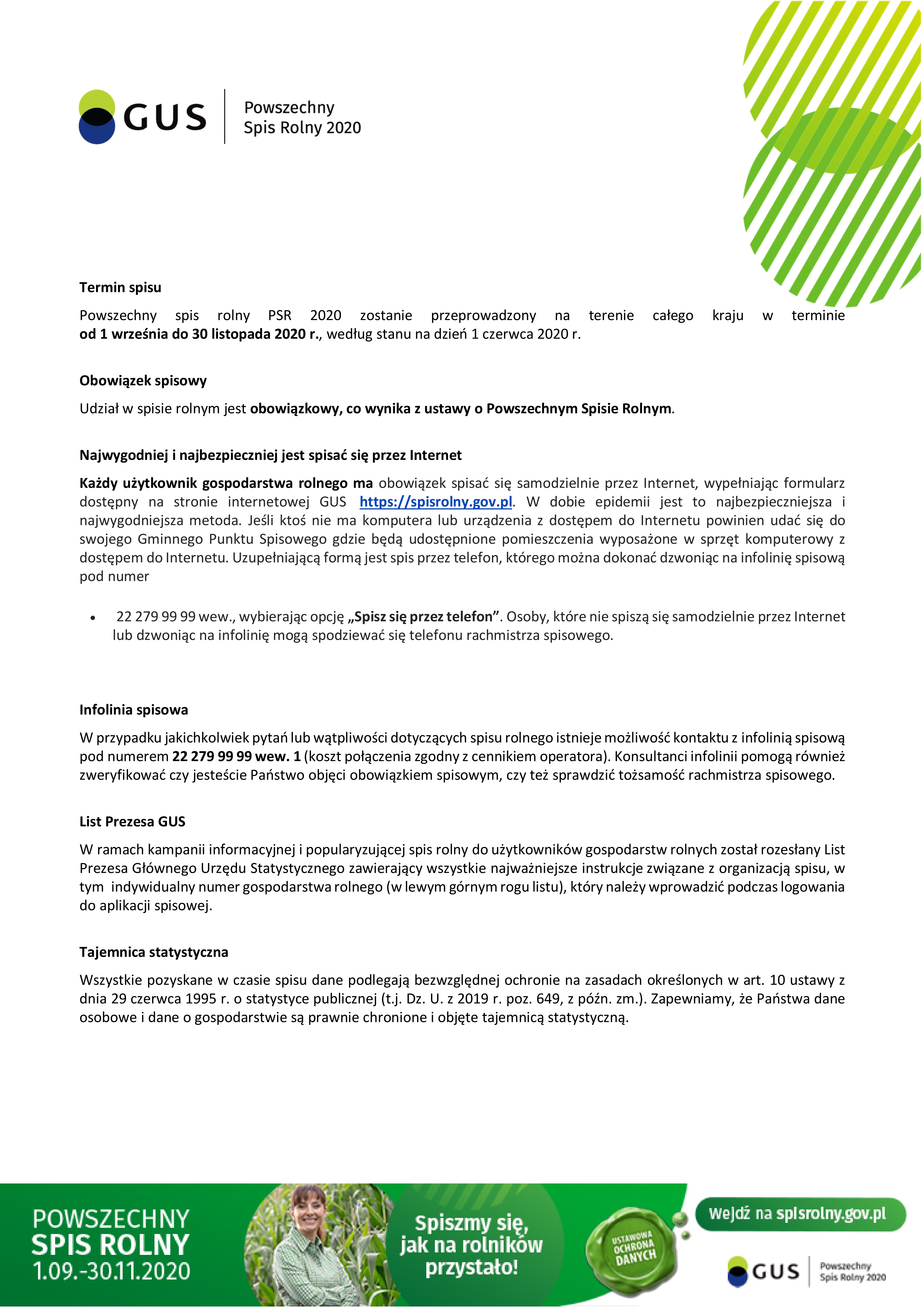Bieżące informacje o spisie rolnym dostępne są na stronie internetowej: https://spisrolny.gov.pl/