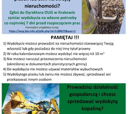 Zgodnie z art. 4 ust. 1 ustawy z dnia 9 czerwca 2011 r. Prawo geologiczne i górnicze możliwe jest wydobywanie bez koncesji piasków i żwirów, przeznaczonych dla zaspokojenia potrzeb własnych osoby fizycznej, z nieruchomości stanowiących przedmiot jej prawa własności, jeżeli jednocześnie wydobycie: będzie wykonywane bez użycia środków strzałowych, nie przekroczy 10 m3 w roku kalendarzowym i nie naruszy przeznaczenia nieruchomości. Warunkiem legalności takiej działalności jest jej zgłoszenie z 7 dniowym wyprzedzeniem na piśmie do właściwego miejscowo urzędu górniczego – w przypadku Gminy Siepraw jest to Okręgowy Urząd Górniczy w Krakowie, ul. Łukasiewicza 3, 31-429 Kraków.