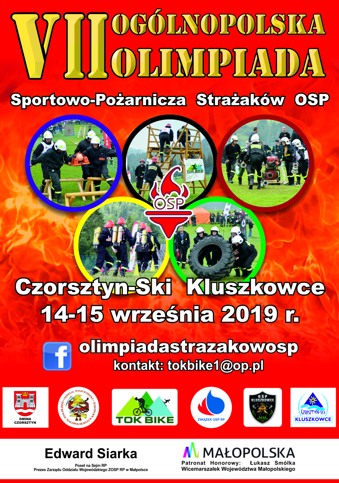 Serdecznie zapraszamy druhny i druhów na VII Ogólnopolską Olimpiadę Sportowo-Pożarniczą Strażaków OSP, która odbędzie się w dniach 14 i 15 września 2019 roku na terenie Ośrodka Czorsztyn - Ski w Kluszkowcach gmina Czorsztyn, woj. małopolskie.