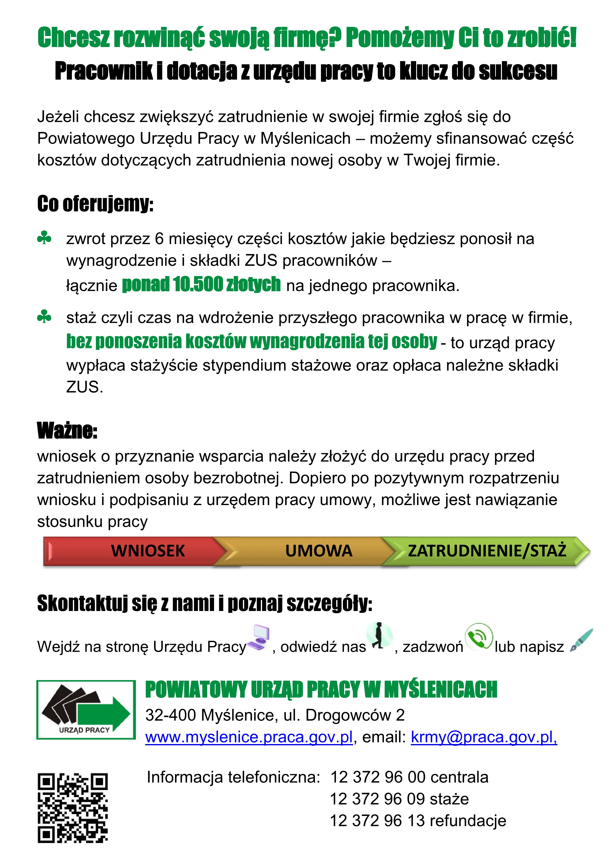 Informacja Dyrektora Powiatowego Urzędu Pracy w Myślenicach na temat oferowanego przez myślenicki urząd wsparcia finansowego dla przedsiębiorców w zakresie zatrudniania pracowników.