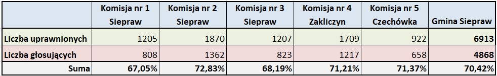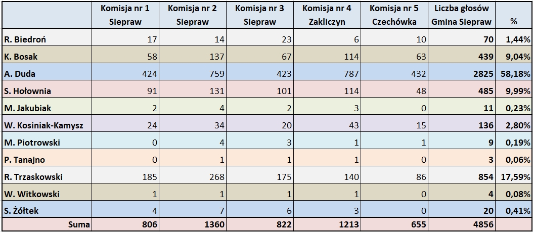 Wyniki I tury wyborów prezydenckich w dniu 28 czerwca 2020 r. na terenie Gminy Siepraw w poszczególnych komisjach obwodowych.