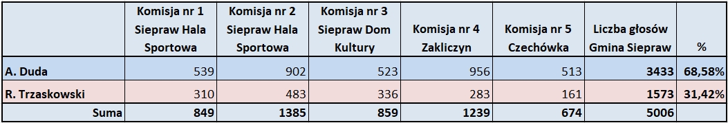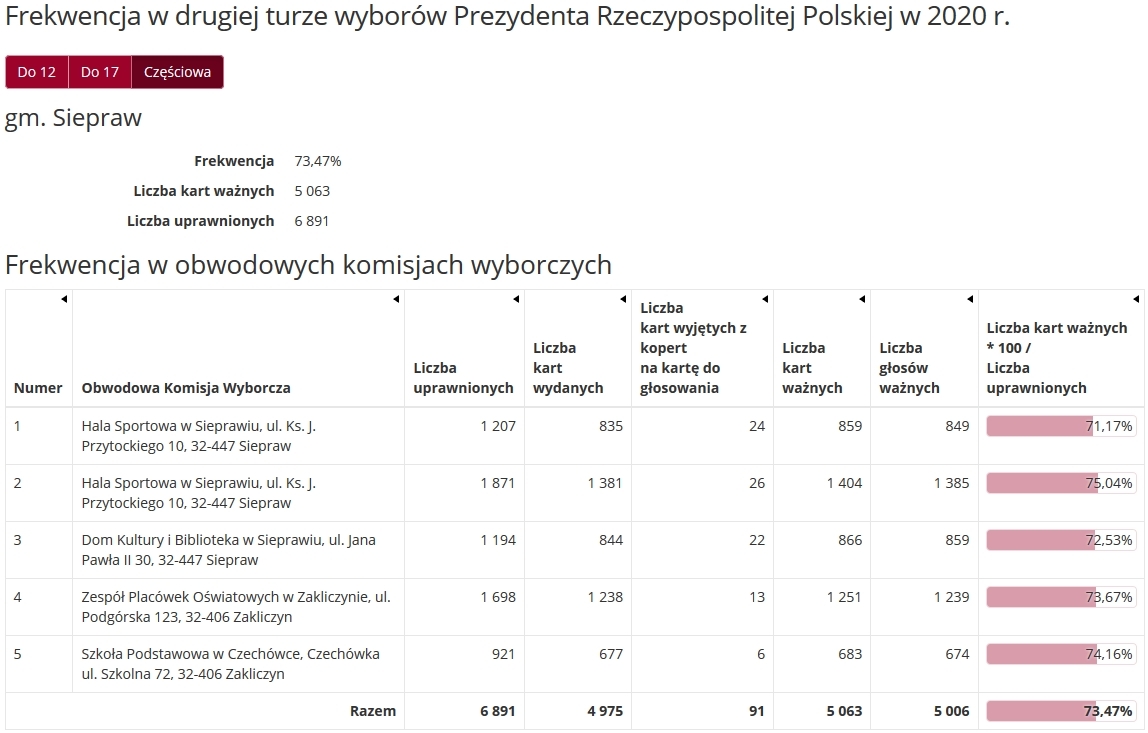 W drugiej turze wyborów Prezydenta RP w Gminie Siepraw głosowało 5063 osób na 6891 uprawnionych, co daje frekwencję na poziomie 73,47%.