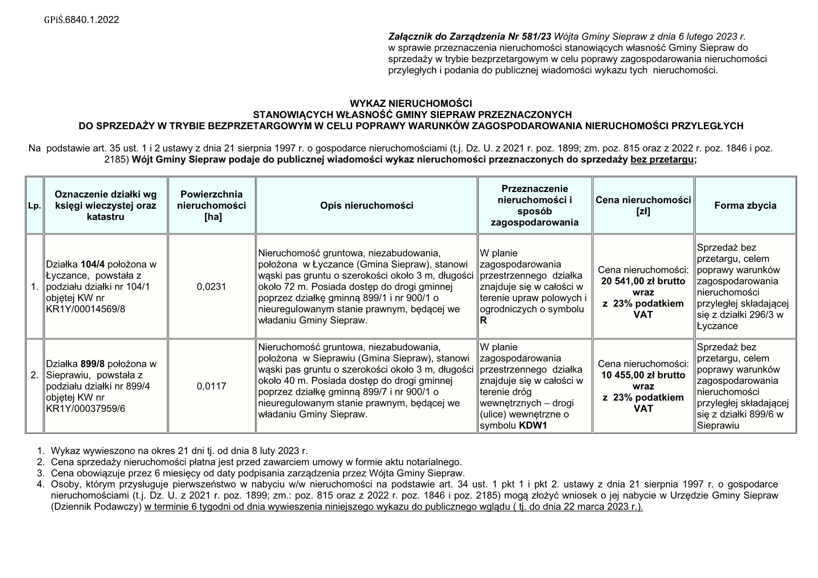 - Przeznacza się do sprzedaży, w trybie bezprzetargowym nieruchomość gruntową, stanowiącą własnością Gminy Siepraw, położoną w Łyczance, oznaczoną w ewidencji geodezyjnej numerem działki 104/4 o powierzchni 0,0231 ha, w celu poprawy warunków zagospodarowania nieruchomości przyległej składającej się z działki ewidencyjnej nr296/3 w Łyczance, stanowiącej własność nabywającego,