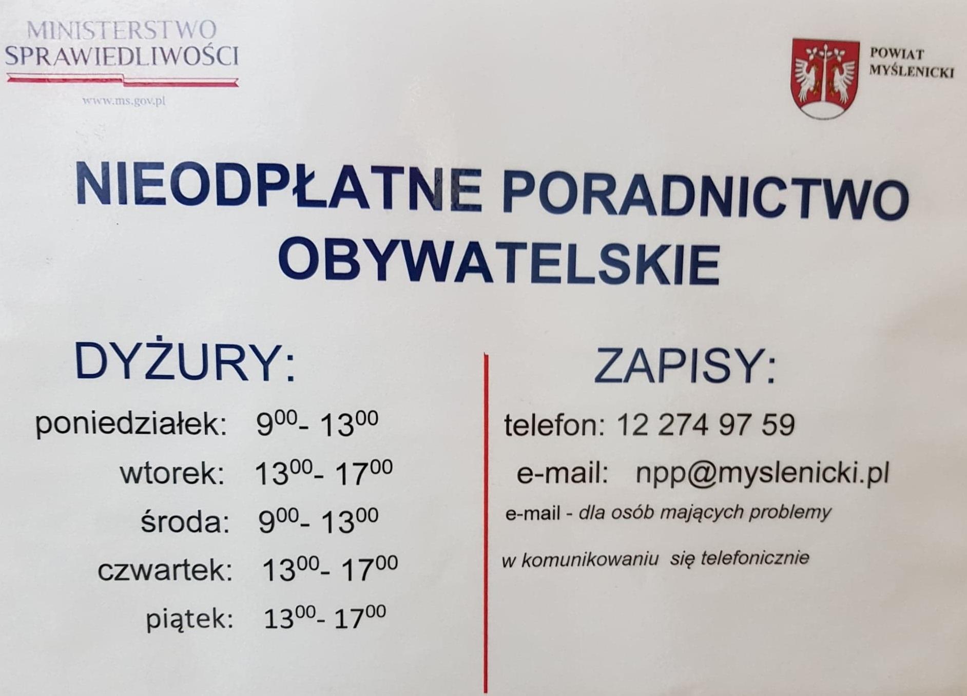 Od 1 stycznia 2023 na terenie Powiatu Myślenickiego będzie działać pięć punktów pomocy prawnej. Trzy punkty które zlokalizowane są w siedzibie Starostwa Powiatowego przy ul. K. Wielkiego 5 (pok. nr 4), Urzędzie Gminy i Miasta Dobczyce Rynku 22, 32-410 Dobczyce oraz Gminie Lubień, 32-433 Lubień 50 będą świadczyć nieodpłatną pomoc prawną. W dwóch pozostałych punkach zlokalizowanych w Urzędzie Gminy Siepraw przy ul. Kawęciny 28, 32-447 Siepraw oraz w Sułkowicach w budynku „Starej Szkoły”- Rynek 6, 32-440 Sułkowice świadczone będzie nieodpłatne poradnictwo obywatelskie. Punkt w Sułkowicach będzie posiadał dodatkowo specjalizację dyżuru w zakresie nieodpłatnej mediacji, dyżur ten będzie pełniony w każdy czwartek.