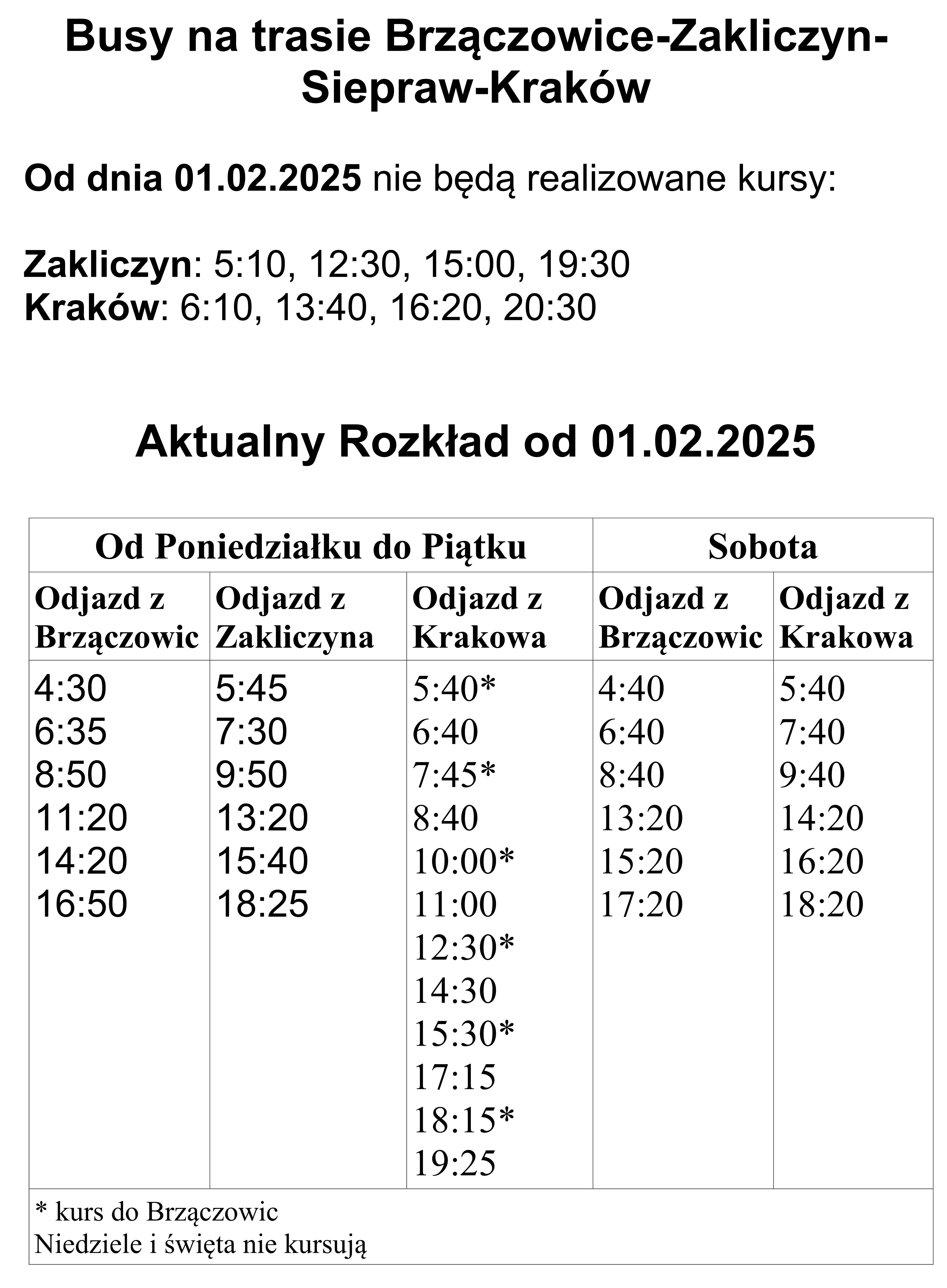Urząd Gminy Siepraw otrzymał zmieniony rozkład jazdy (zmniejszenie liczby kursów) od przewoźników, świadczących usługi na linii Brzączowice (Zakliczyn) - Kraków wraz z ich oświadczeniem: