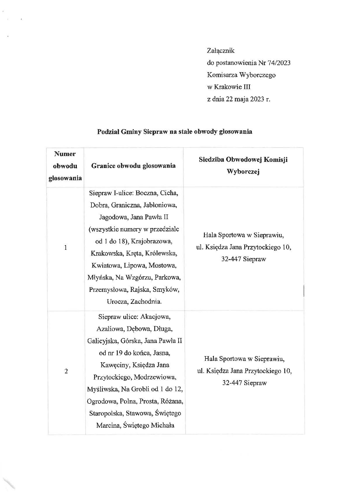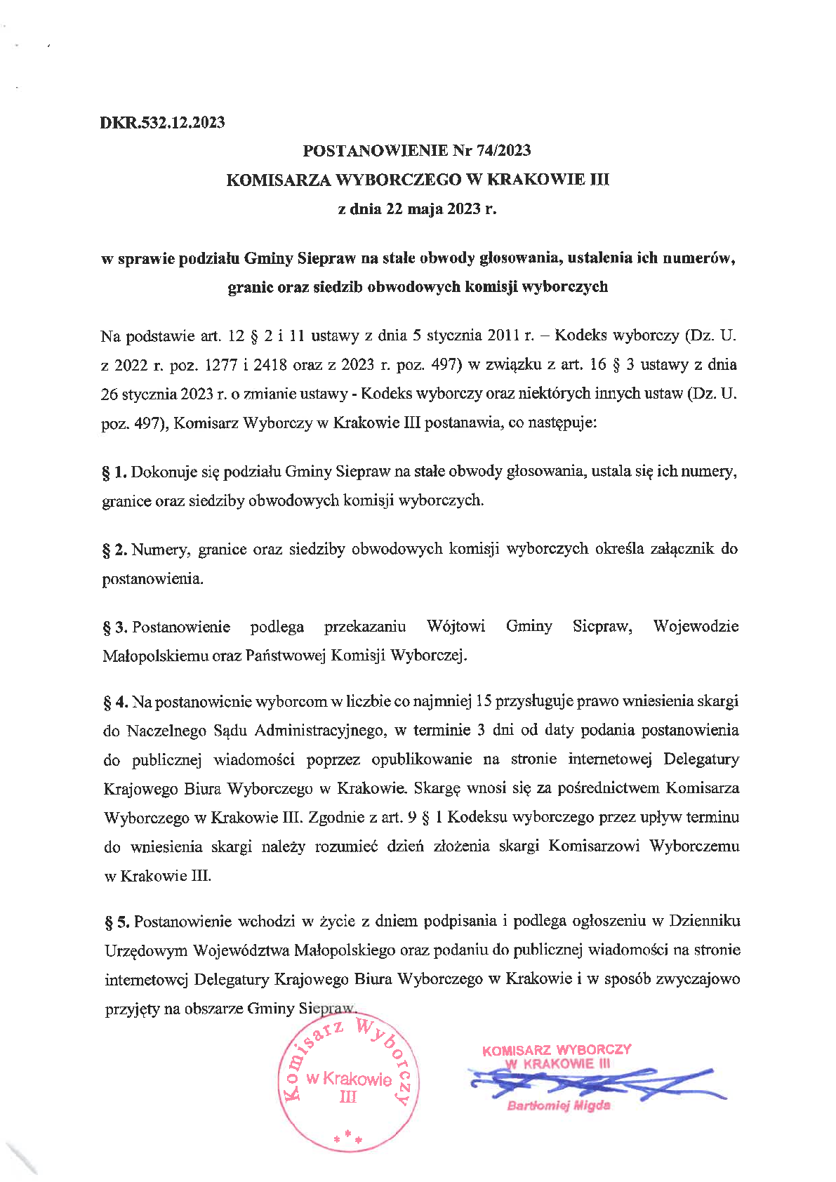 Postanowienie nr 74/2023 Komisarza Wyborczego w Krakowie III z dnia 22 maja 2023 r. w sprawie podziału Gminy Siepraw na stałe obwody głosowania, ustalenia ich numerów, granic oraz siedzib obwodowych komisji wyborczych.