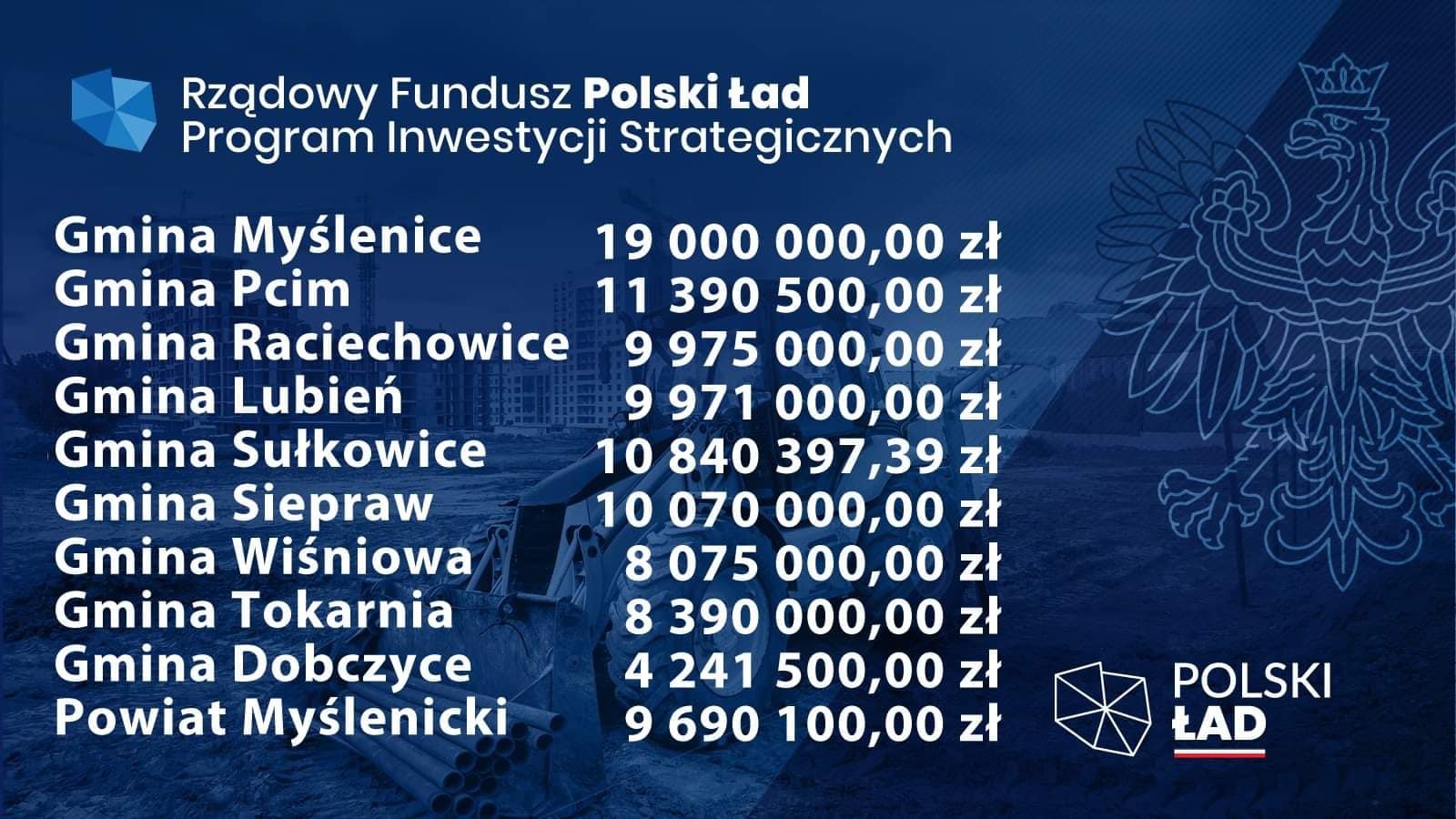 Lokalnie dla terenu Powiatu Myślenickiego ogłoszenie wyników naboru do Polskiego Ładu odbyło się w biurze poselskim Posła na Sejm RP Władysława Kurowskiego. Gminę Siepraw podczas konferencji prasowej reprezentował Sekretarz Gminy Michał Baran, który podziękował za wsparcie Panu Posłowi oraz Panu Premierowi Mateuszowi Morawieckiemu oraz wyraził nadzieję, że to nie ostatnie dofinansowanie z Rządowego Funduszu dla Gminy Siepraw.
