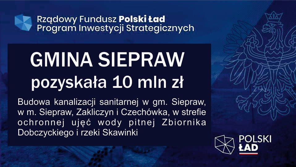 W poniedziałek 25 października br. Premier Mateusz Morawiecki ogłosił wyniki naboru w Rządowym Funduszu Polski Ład: Program Inwestycji Strategicznych. Gmina Siepraw otrzymała dofinansowanie w wysokości 95% tj. 10 070 000 zł na zadanie: