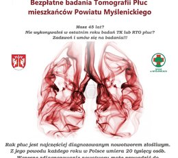 - Profilaktyka Raka Płuc - program skierowany jest do mieszkańców zameldowanych na terenie gmin powiatu myślenickiego, którzy ukończyli 45 r.ż. , nie chorują na choroby płucne i nie są objęte opieką poradni specjalistycznych zajmujących się chorobami płuc, oraz u których w ostatnim roku nie wykonywano badań RTG lub tomografii komputerowej. U osób spełniających powyższe kryteria zostanie wykonane badanie tomograficzne płuc. Przy odbiorze wyników pacjent będzie miał udzieloną edukacyjną poradę profilaktyczną obejmującą swoim zakresem tematycznym profilaktykę raka płuc i innych chorób układu oddechowego, w tym POChP i astmy oraz poradę lekarza specjalisty, obejmującą swoim zakresem analizę wyników badań TK. Badania wykonywane są w SPZOZw Myślenicach z siedzibą przy ul. Szpitalnej 2, 32-400 Myślenice (szpital). Pacjenci umawiają się sami pod numerem telefonu : 12 273 03 36.