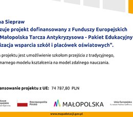 W ramach Projektu pn. „Małopolska Tarcza Antykryzysowa – Pakiet Edukacyjny II. Realizacja wsparcia szkół i placówek oświatowych” Grant nr 1 w ramach Osi Priorytetowej Wiedza i Kompetencje, Działanie 10.1.6 Cyfryzacja szkół prowadzących kształcenie ogólne Regionalnego Programu Operacyjnego Województwa Małopolskiego na lata 2014-2020 Gmina Siepraw otrzymała dofinansowanie w kwocie 74 787,80 zł .