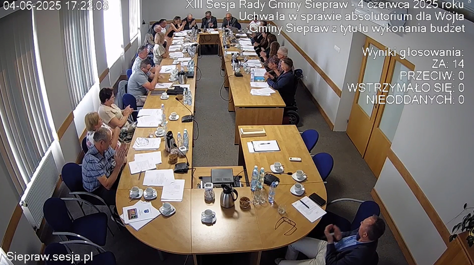 4 czerwca 2025 r. odbyła się sesja Rady Gminy Siepraw Nr XIII na której radni podjęli kilka ważnych uchwał związanych z podsumowaniem roku 2024. Po przedstawieniu przez Wójta Tadeusza Pitalę Raportu o stanie Gminy w 2024 roku i krótkiej debacie, Rada udzieliła Wójtowi wotum zaufania. Następnie radni zatwierdzili sprawozdanie finansowe oraz sprawozdanie roczne z wykonania budżetu Gminy Siepraw za 2024 rok, a w konsekwencji podjęto jednomyślnie uchwałę w sprawie absolutorium dla Wójta Gminy Siepraw z tytułu wykonania budżetu Gminy Siepraw za 2024 rok.