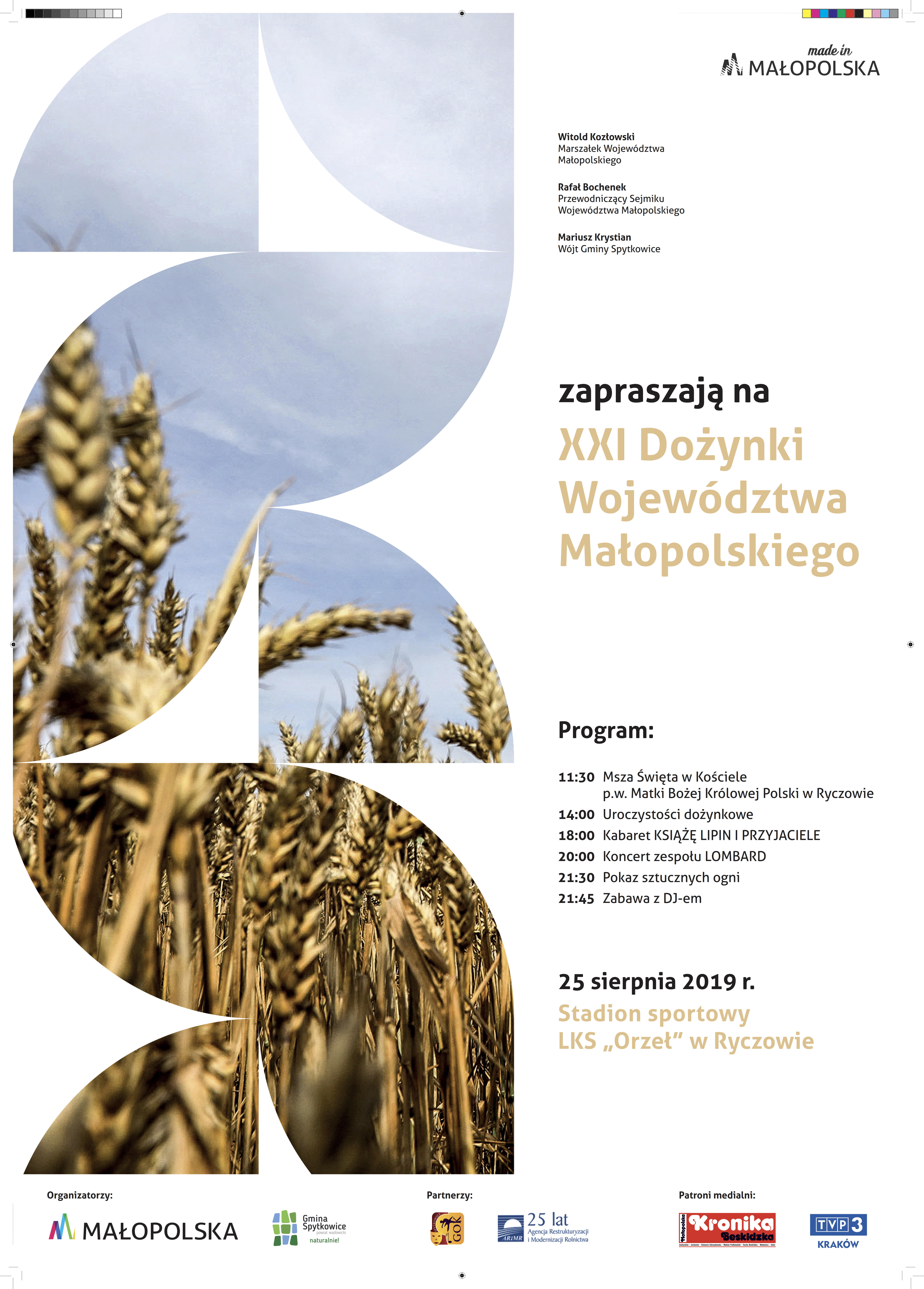 Marszałek Województwa Małopolskiego Witold Kozłowski, Przewodniczący Sejmiku Województwa Małopolskiego Rafał Bochenek oraz Wójt Gminy Spytkowice Mariusz Krystian zapraszają na XXI Dożynki Województwa Małopolskiego, które odbędą się 25 sierpnia 2019 r. w Ryczowie.