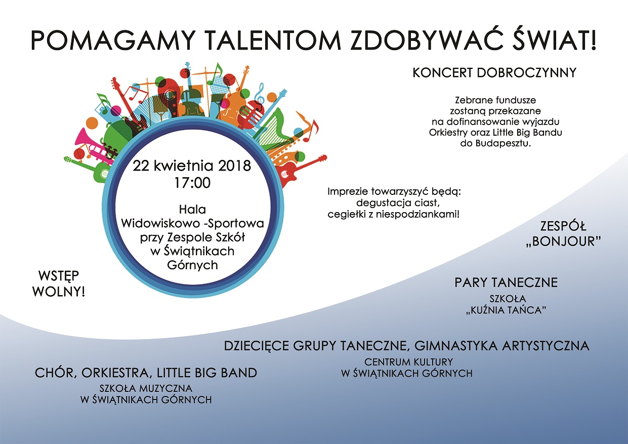 Szkoła Muzyczna w Świątnikach Górnych serdecznie zaprasza na Koncert Dobroczynny POMAGAMY TALENTOM ZDOBYWAĆ ŚWIAT!, który odbędzie się 22 kwietnia o g. 17:00 na Hali Widowiskowo - Sportowej przy Zespole Szkół w Świątnikach Górnych. Szczegóły na plakacie.
