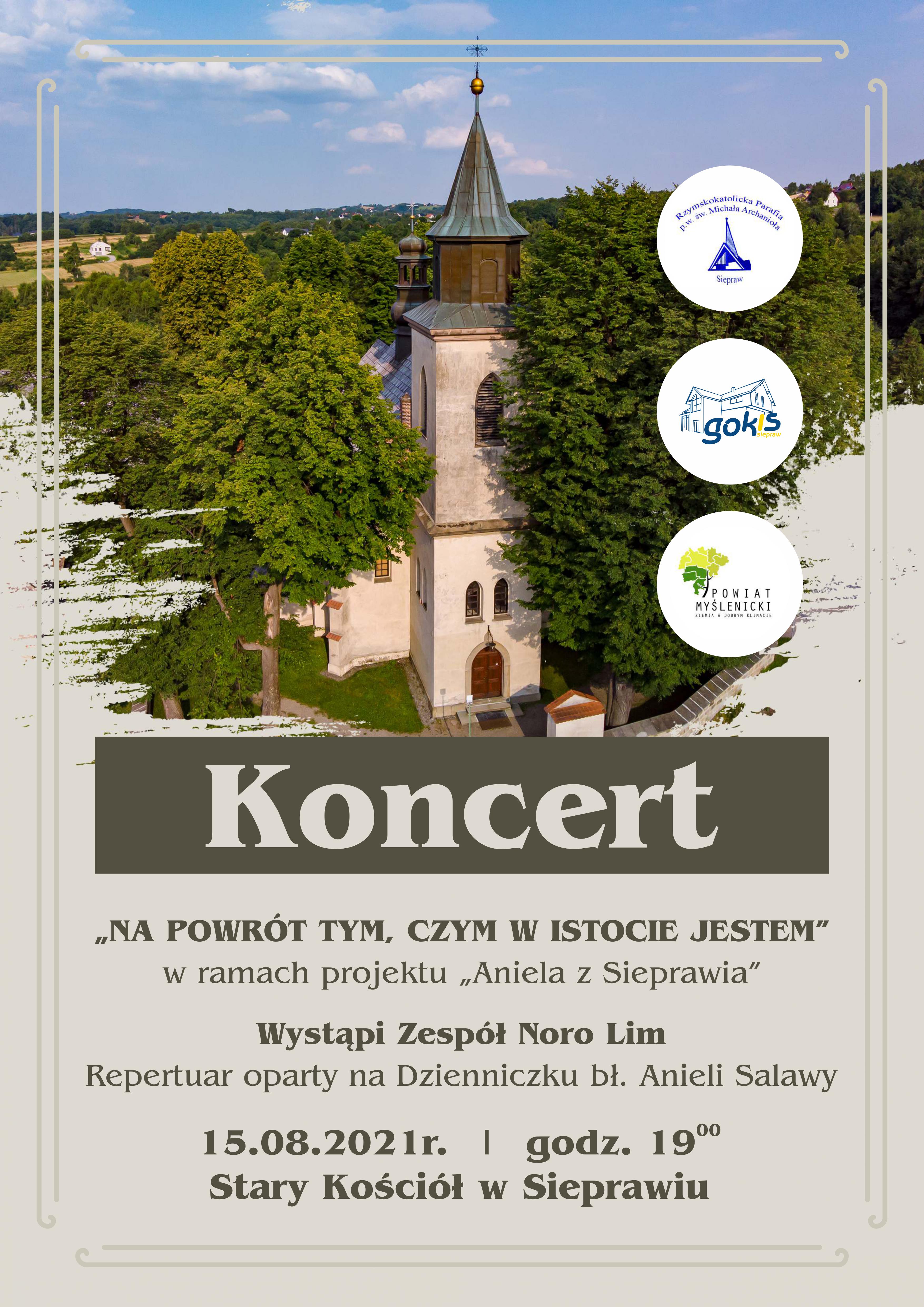 Gminny Ośrodek Kultury i Sportu wraz z Parafią w Sieprawiu oraz Starostwem Powiatowym w Myślenicach serdecznie zapraszają na koncert Zespołu Noro Lim, który odbędzie się 15 sierpnia o godzinie 19.00 w Starym Kościele w Sieprawiu.