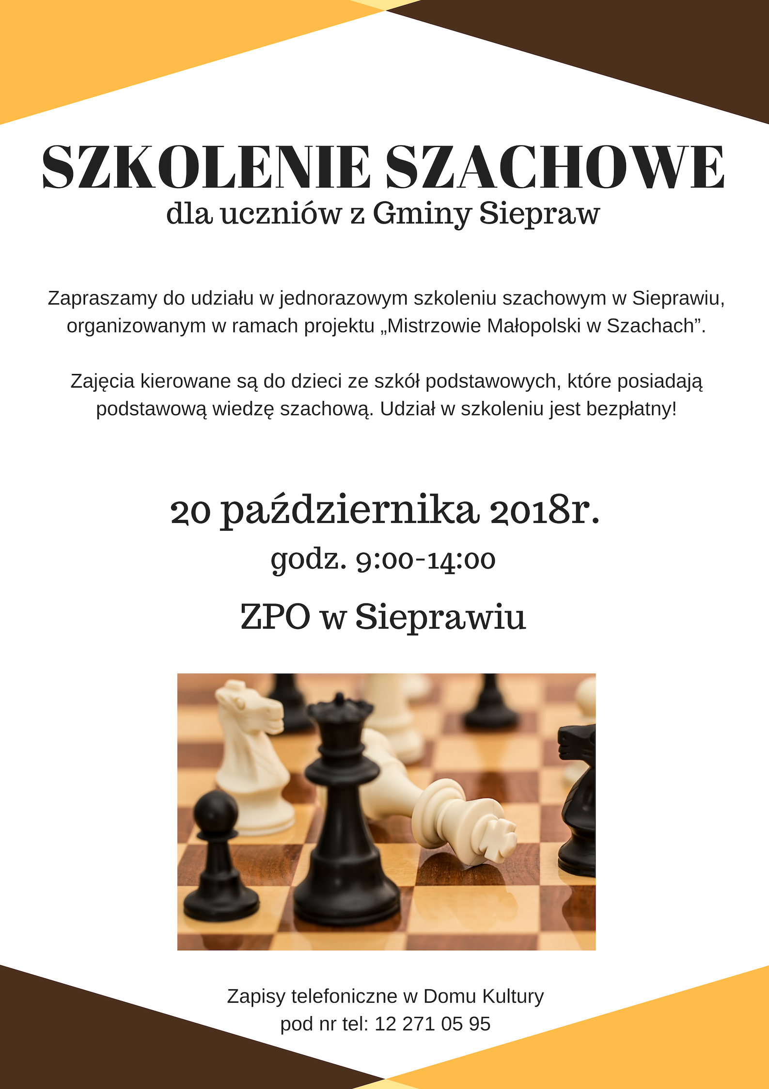 W ramach projektu zapraszamy uczniów z sieprawskich szkół do udziału w jednorazowym szkoleniu szachowym, które odbędzie się w sobotę 20 października w godzinach 9:00-14:00 w budynku ZPO w Sieprawiu. Zajęcia będą składały się z prowadzonej w grupach części instruktażowej (2x1,5h) oraz z części praktycznej – turnieju. Udział w szkoleniu jest bezpłatny. Na zajęcia obowiązują zapisy telefoniczne pod nr: 12 271 05 95 lub bezpośrednio w Domu Kultury. Prosimy również o dostarczenie do Domu Kultury podpisanego przez rodziców formularza, znajdującego się w załączniku.