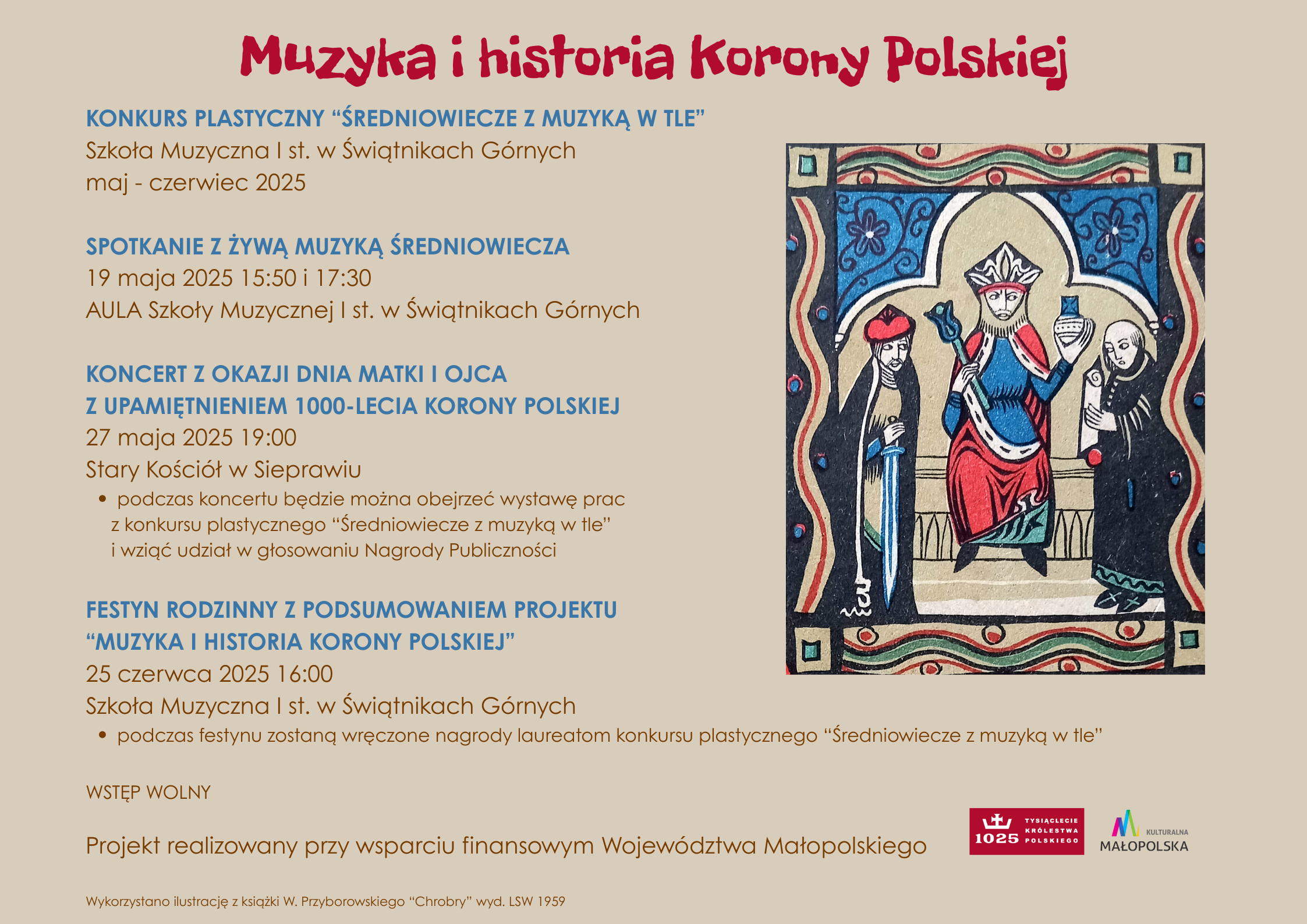 Stowarzyszenie "Klucz do Muzyki w Świątnikach Górnych" oraz Szkoła Muzyczna I st. w Świątnikach Górnych zapraszają na wydarzenia kulturalne z okazji 1000 - lecia Koronacji Bolesława Chrobrego na Króla Polski.
