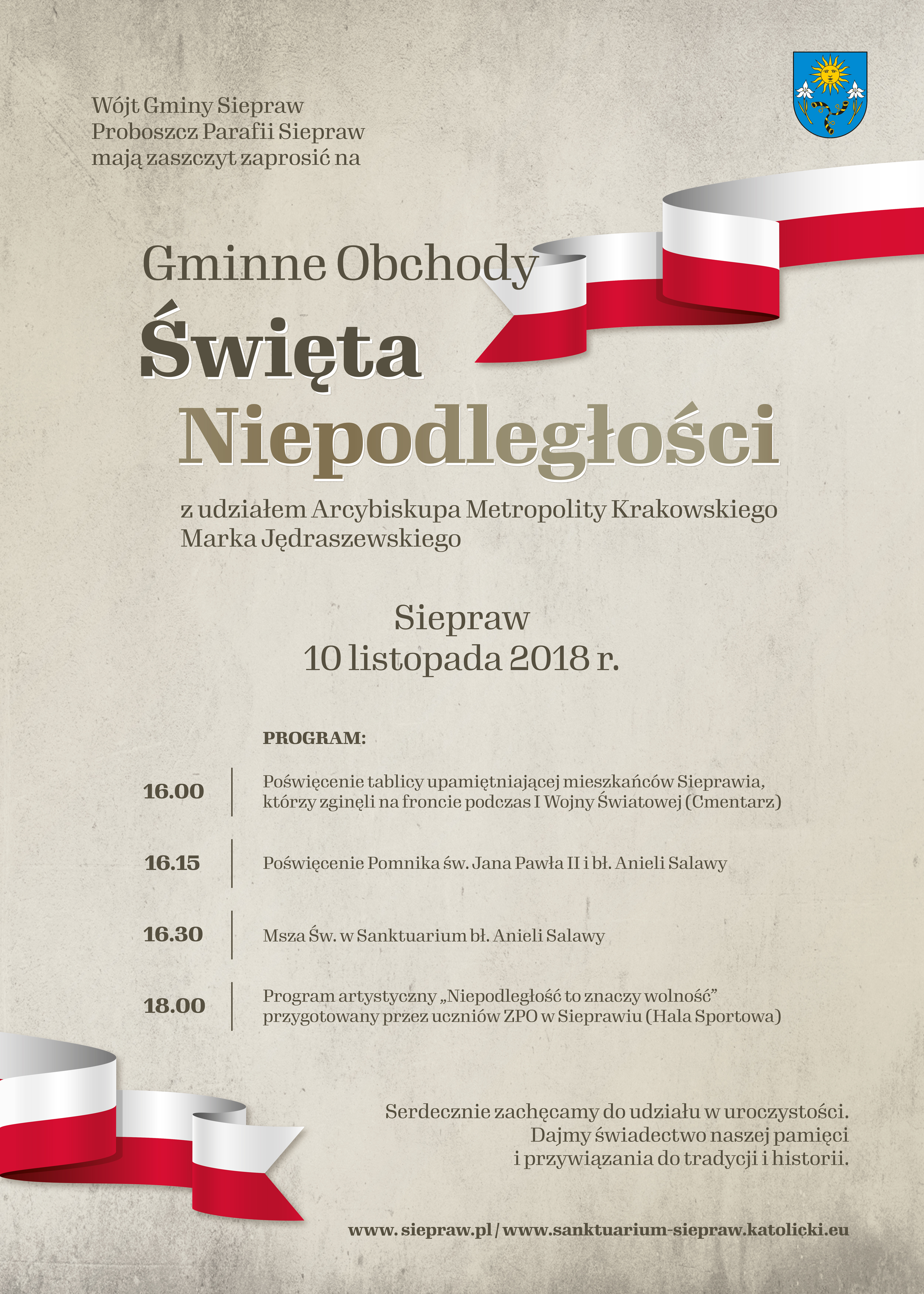 Po uroczystościach kościelnych serdecznie zapraszamy na Halę Sportową w Sieprawiu, gdzie odbędzie się program artystyczny "Niepodległość to znaczy wolność" przygotowany przez uczniów ZPO w Sieprawiu.