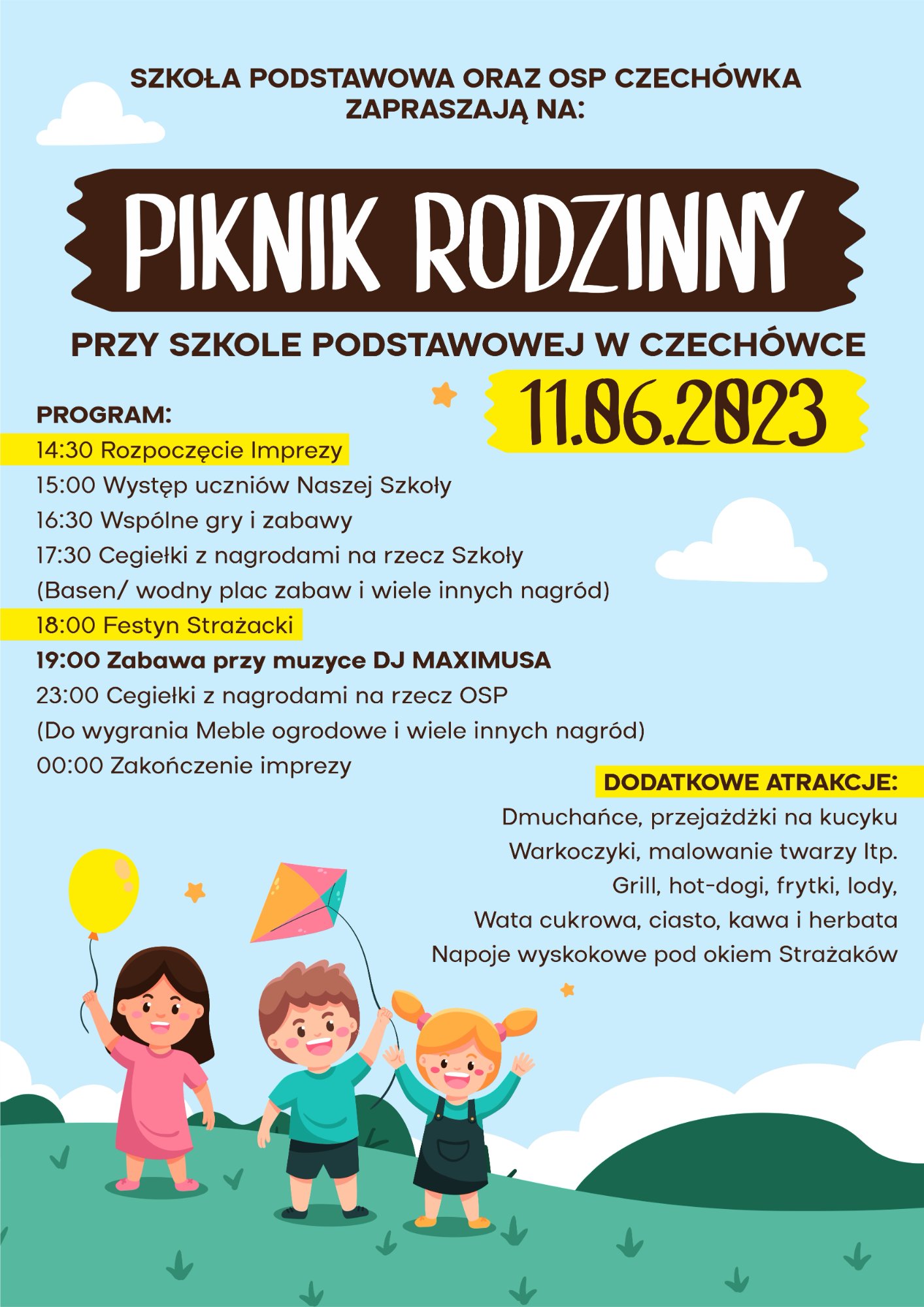 Szkoła Podstawowa w Czechówce oraz OSP Czechówka zapraszają na piknik rodzinny, który odbędzie się 11 czerwca br. przy Szkole Podstawowej w Czechówce. Rozpoczęcie imprezy o godzinie 14.30.