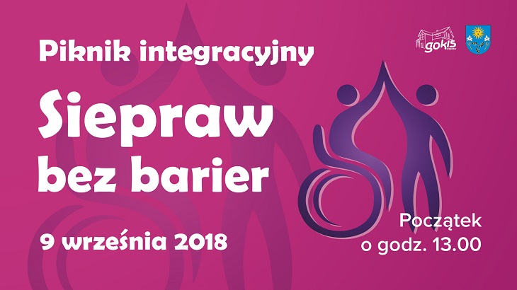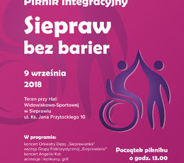 Serdecznie zapraszamy w najbliższą niedzielę (9 września) na piknik „Siepraw Bez Barier”. Impreza odbędzie się przy hali sportowej w Sieprawiu, start o godzinie 13:00. W programie występy Orkiestry Dętej "Sieprawianki", Grupy Folklorystycznej "Sieprawianie" oraz koncert Angeliki Kot.