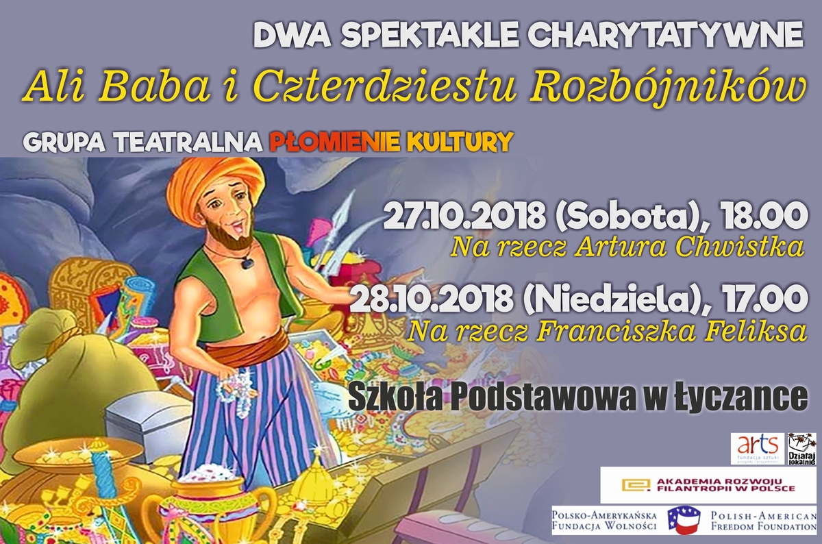 Grupa Teatralna "PŁOMIENIE KULTURY" serdecznie zaprasza na spektakle charytatywne "Alibaba i czterdziestu rozbójników". Pierwszy odbędzie się w dniu 27 października br. (sobota) o godzinie 18.00 na rzecz Artura Chwistka, a drugi w dniu 28 października br. (niedziela) o godzinie 17.00 dla Frania Feliksa, szczegóły na plakacie. Miejsce: sala gimnastyczna przy Szkole Podstawowej w Łyczance.