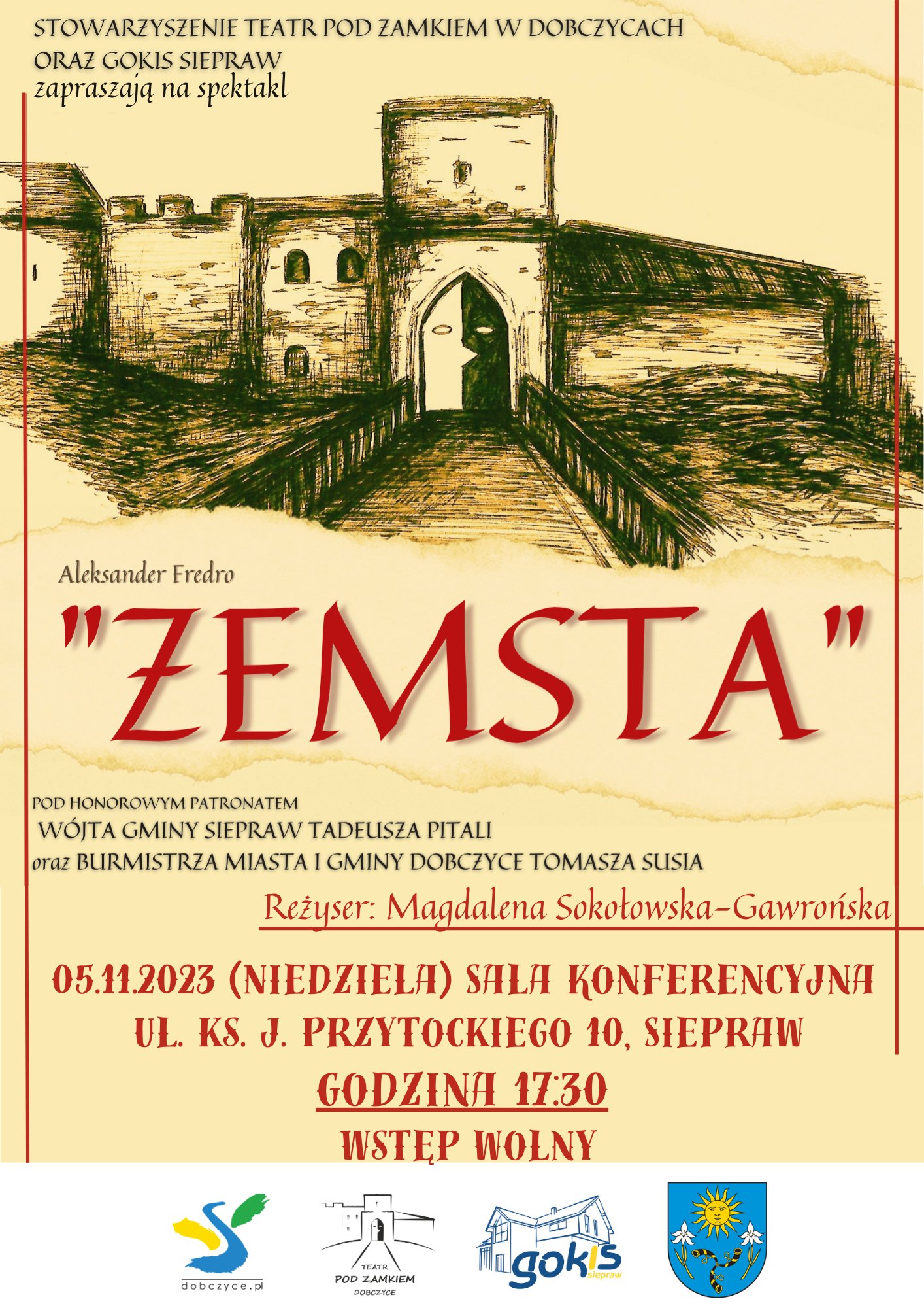 Wraz ze Stowarzyszeniem Teatr pod Zamkiem w Dobczycach serdecznie zapraszamy na spektakl "Zemsta" Aleksandra Fredry w reżyserii Magdaleny Sokołowskiej-Gawrońskiej.