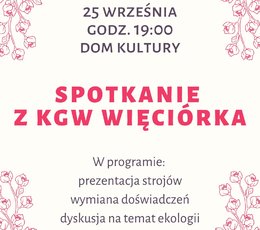 Wszystkie osoby zainteresowane działalnością kół gospodyń i gospodarzy wiejskich zapraszamy na spotkanie, które odbędzie się w środę 25 września o godzinie 19:00 w Domu Kultury w Sieprawiu.
