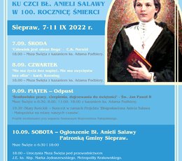 Serdecznie zapraszamy na uroczystość odpustową ku czci bł. Anieli Salawy, połączonej z ogłoszeniem Jej patronką Gminy Siepraw. Szczegóły na plakacie.