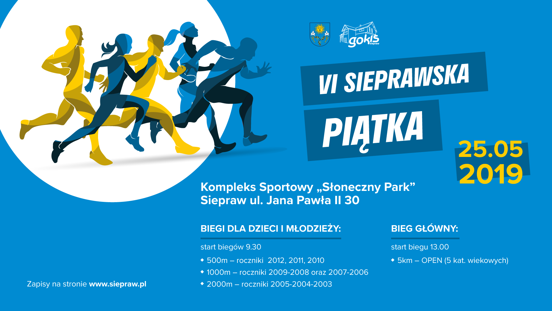 Biegiem… na stronę zapisową!. Ruszyły zapisy na 6 edycję imprezy biegowej „Sieprawska Piątka” 25 maja 2019r. Tradycyjnie rozpoczynamy biegami dla dzieci i młodzieży a zwieńczeniem jest tytułowa Piątka czyli dystans 5km po malowniczym centrum Sieprawia.