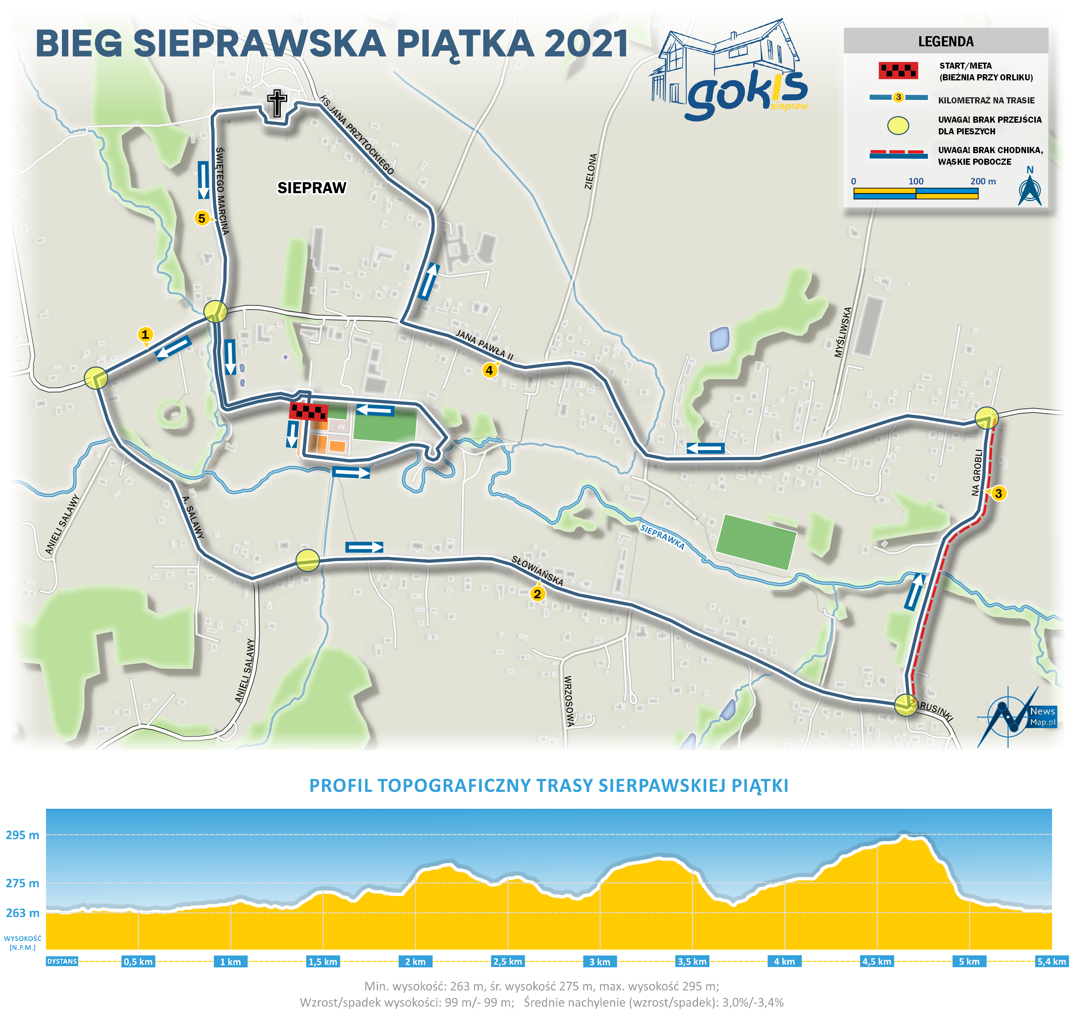 Zapisy na bieg główny VIII Sieprawskiej Piątki wystartują 1 czerwca. Swoje zgłoszenia możecie wysyłać w dniach 1 czerwca – 21 czerwca. Do udziału w biegu głównym niezbędne jest samodzielne zmierzenie trasy oraz czasu przebiegu za pośrednictwem dowolnej dostępnej na rynku aplikacji biegowej. W załączniku znajdziecie trasę biegu głównego. Uwaga! Tegoroczny dystans Sieprawskiej Piątki wynosi 5 km i 400 m! Tym razem po wybiegnięciu ze Słonecznego Parku zmieniamy kierunek trasy. Dodaliśmy również odcinek biegnący koło Sanktuarium w Sieprawiu. Pamiętajcie również, że na czas Waszych przebiegów drogi nie zostaną zamknięte. Na mapie biegu znajdziecie oznaczenia wskazujące miejsca bez przejść dla pieszych i bez chodnika. Trasa biegu zostanie oznaczona w taki sposób byście byli pewni, że nie zbiegacie z kursu. Pamiętajcie również o swoim bezpieczeństwie i zapewnieniu swojej widoczności w przypadku, jeśli postanowicie biegać po zmroku.
