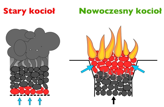 - trzeba rozpalać większą ilość paliwa cyklicznie – nie ma możliwości łatwego dołożenia paliwa, bo dla zachowania spalania współprądowego należałoby dokładać pod spód żaru. Trzeba nauczyć się planować ilość ładowanego paliwa. Nie jest to tak trudne jak się wydaje, ale wymaga kilku tygodni wprawy. W razie najgorszych mrozów paląc węglem kamiennym w większości domów nie będzie potrzeby rozpalania więcej niż dwa razy dziennie a przez ~80% sezonu grzewczego wystarczy rozpalać raz na dobę. Spalanie współprądowe bez ponownego rozpalania umożliwiają kotły dolnego spalania.