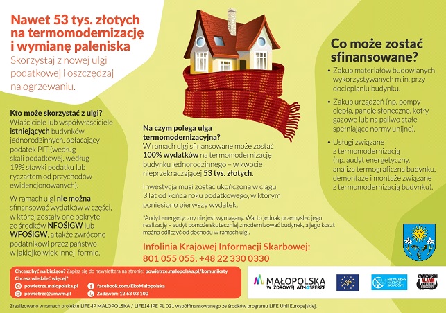 Ulga pozwala na odliczenie od dochodów (przychodów) wydatków związanych z realizacją przedsięwzięć termomodernizacyjnych, wymiany źródeł ogrzewania oraz instalacji odnawialnych źródeł energii w budynkach mieszkalnych jednorodzinnych.