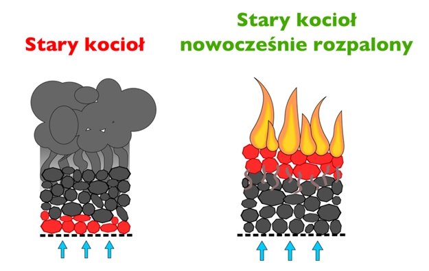 - brudne spalanie przeciwprądowe – ten powszechnie znany sposób polega na sypaniu paliwa na żar ile wlezie. Większość nieprzyjemności związanych z ogrzewaniem węglowym “zawdzięczamy” tej właśnie technice, gdyż uniemożliwia ona pełne spalanie opału.