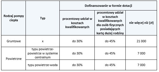 Wsparcie udzielane będzie w formie bezzwrotnej dotacji stanowiącej do 30% kosztów kwalifikowanych inwestycji. W przypadku posiadania przez wnioskodawcę karty dużej rodziny (KDR) – aż do 45%. Wartość dopłat, mieści się w przedziale od 7 do 21 tys. zł. Na najwyższe wsparcie mogą liczyć osoby składające wniosek o dofinansowanie do gruntowej pompy ciepła.