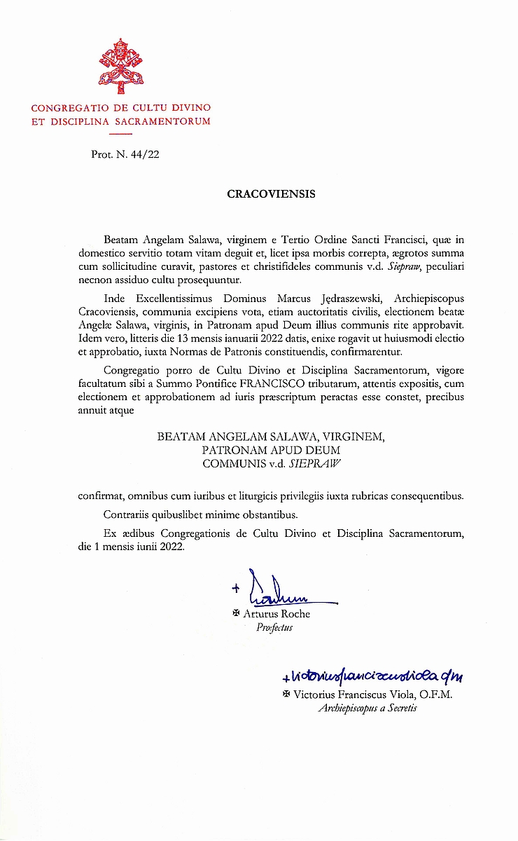 Dekret Kongregacji ds. Kultu Bożego i Dyscypliny Sakramentów Stolicy apostolskiej w sprawie ustanowienia Błogosławionej Anieli Salawy Patronką Gminy Siepraw