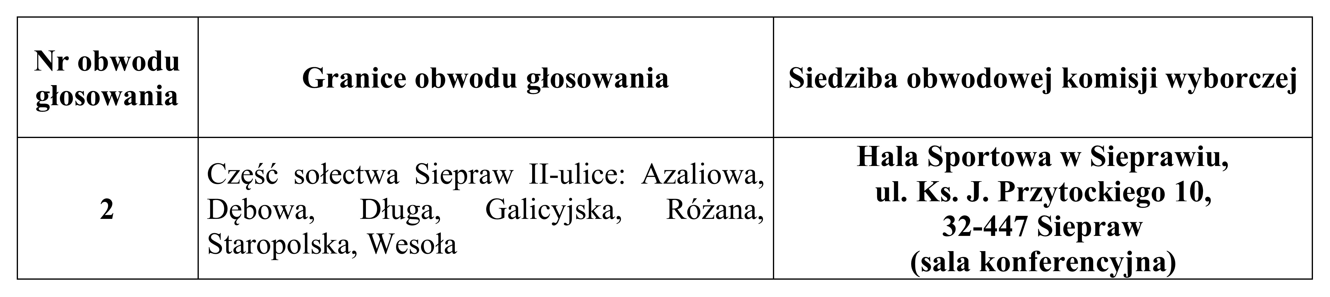 - podanie do publicznej wiadomości przez Wójta Gminy Siepraw, w formie obwieszczenia, informacji Komisarza Wyborczego w Krakowie III o numerze i granicach obwodu głosowania nr 2 oraz o wyznaczonej siedzibie Obwodowej Komisji Wyborczej nr 2