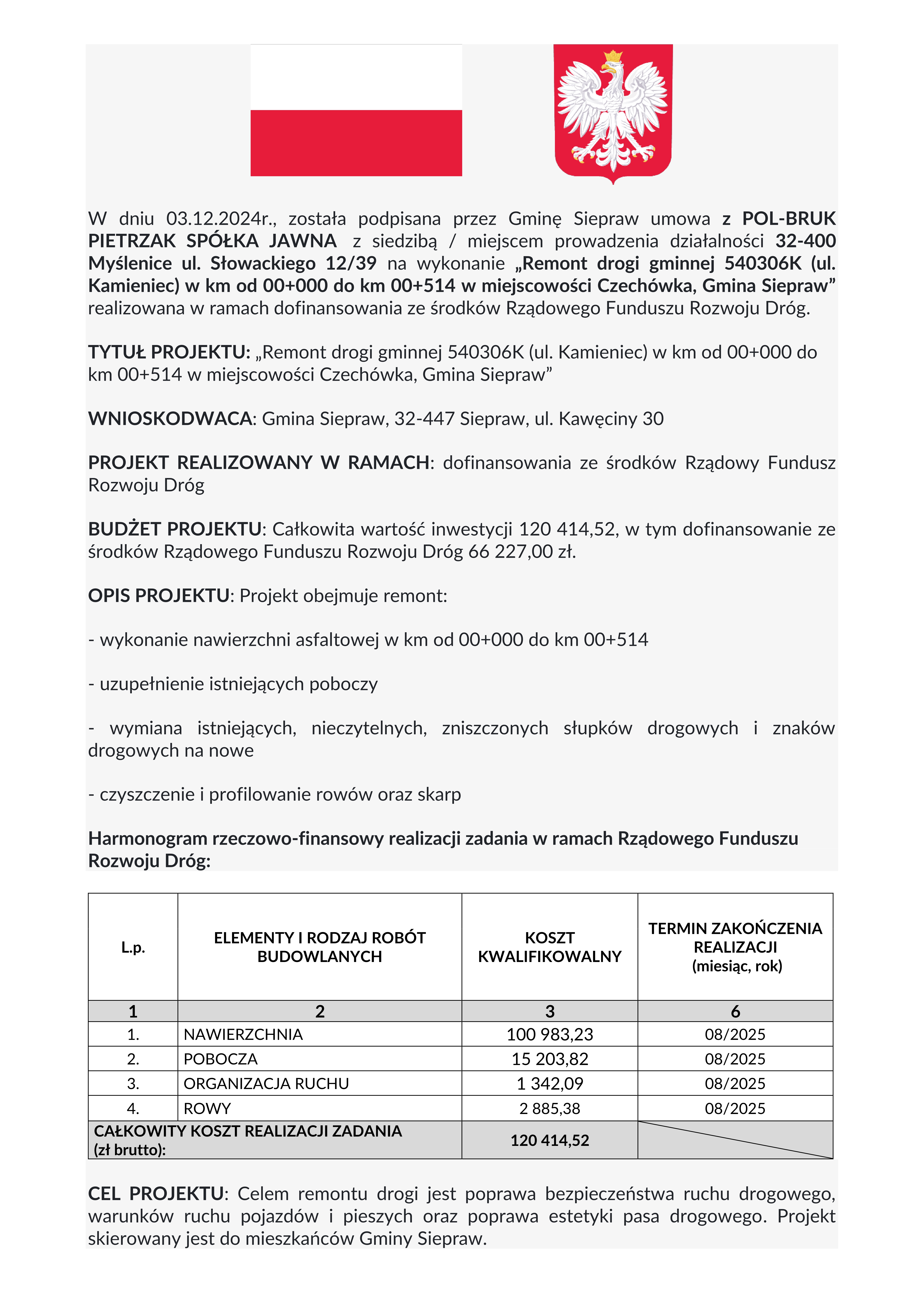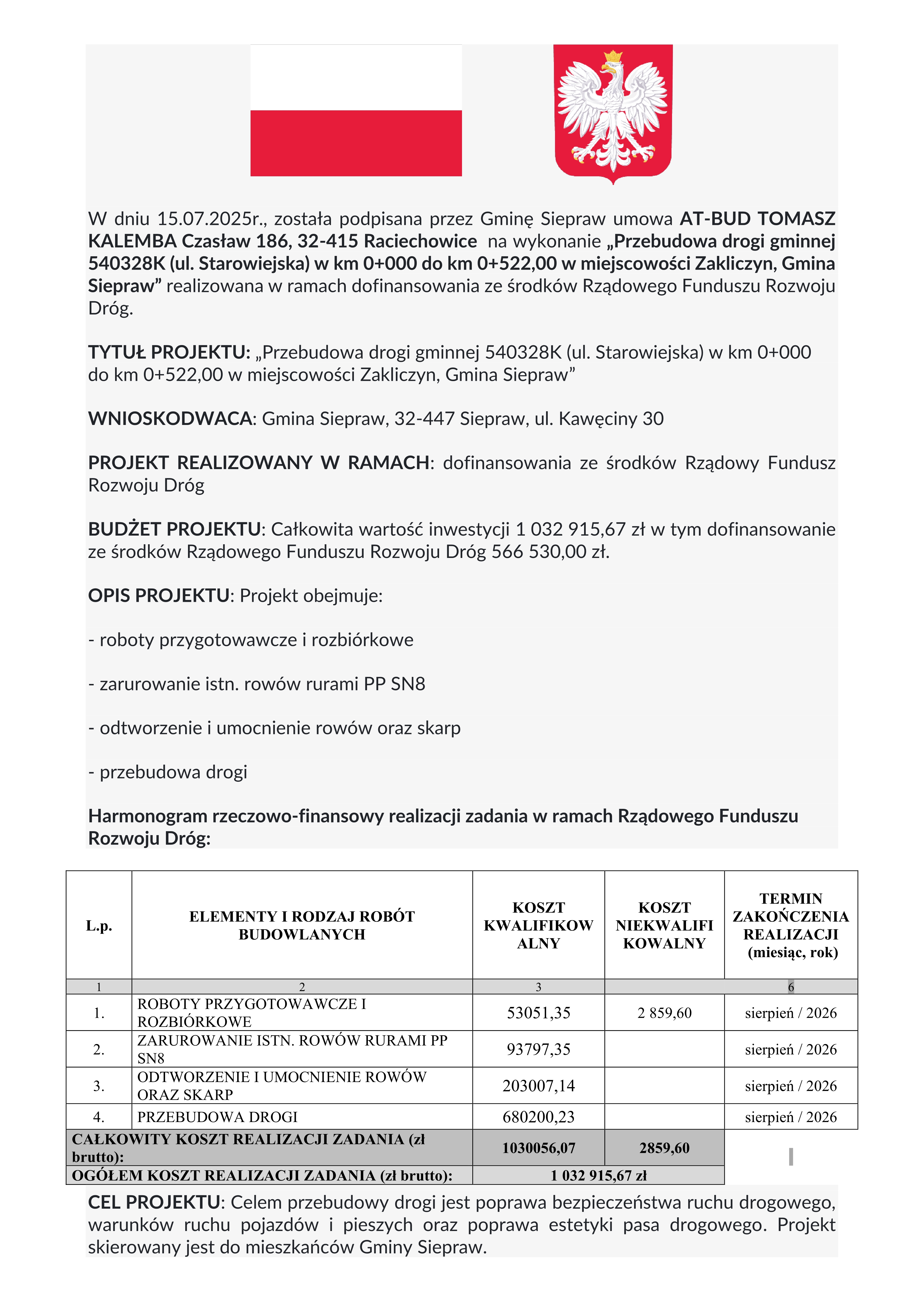 TYTUŁ PROJEKTU: „Przebudowa drogi gminnej nr 540310K od km 0+000,00 do km 1+932,75 wraz ze skrzyżowaniami z drogami powiatowymi nr: K1945 w km 0+000,00, K1944 w km 1+932,75 w miejscowości Siepraw, Gmina Siepraw”